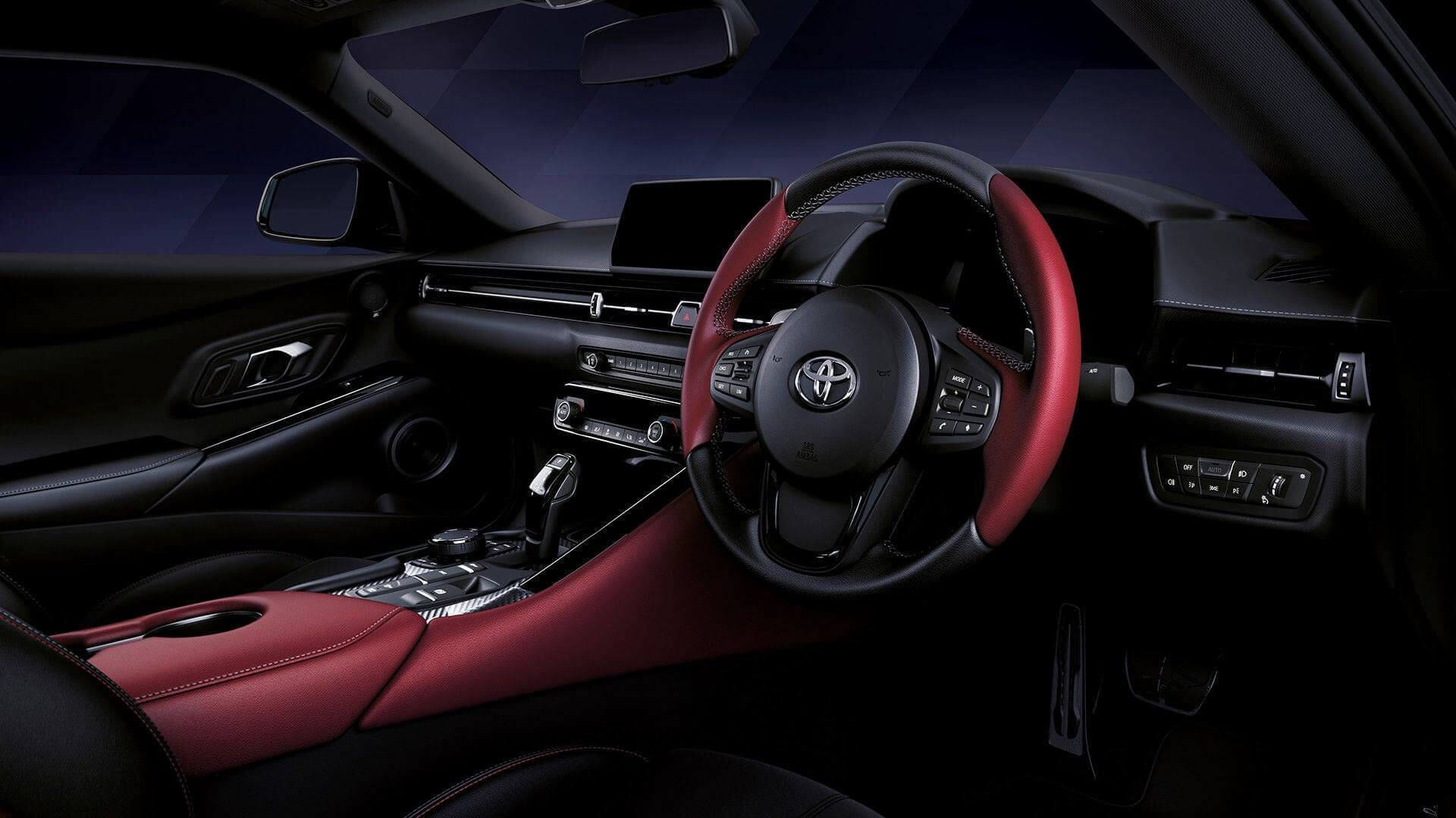 The new GR Supra owns the road with intelligent and dynamic design. Viewed in profile, the lowest point of the bonnet flows near-horizontally to the rear of the car for an ultra-athletic stance. The low placement of the rear spoiler further facilitates the creation of a low, continuously flowing belt line. Finally, the combination of the rearward-slanting cabin silhouette and forward slanting-underbody epitomises classic sports car styling. The GR Supra can be ordered with the choice of either an all-black interior for a focused, minimalist feel, or a more expressive and individualised black and red combination.